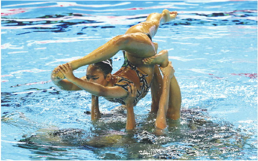 中国花样游泳队在24日进行的集体技巧预赛中亮相。 Ic photo供图