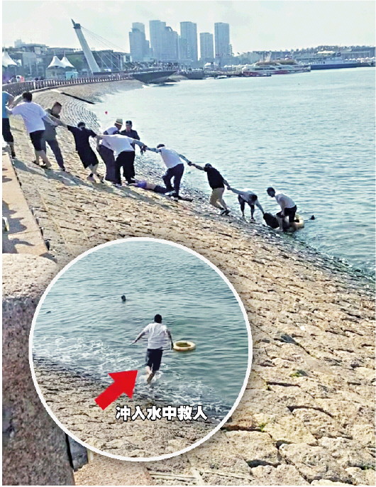 “玉米阿姨”刘玉荣救人的善举还在被人暖心回味,又一起救人事件在青岛上演。7月25日8时25分左右,一名女子在五四广场附近海边落水,附近一名保安以及一名来自福建的游客发现后,立即跳下海将女子救到岸边,随后八九名市民游客手拉手,连成一条“人链”最终将人救起。近年来,青岛海边多次上演生命接力的画面,诸多英勇救人的善举如潮涌来,为这座城市谱写着温暖的旋律。 记者 程凌润 青岛报道 网友“大粒儿”摄影