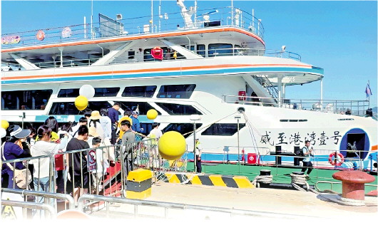 “好客山东·半岛1号”首批开通5条航线,涉及青岛、烟台、威海、日照4市,涵盖鲁辽跨省“黄渤海游”、长岛跳岛游和城市滨海观光游等海上旅游产品类型。结合数百项“吃住行游购娱”优惠政策,无疑将成为暑期山东文旅市场的强力助推器。图为游客在威海港登上“威至港湾壹号”游船,开启惬意的海上游。 王震 摄