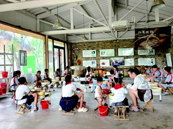 第三组孩子则走进陶朱公坊,拉坯机和陶泥已就位。老师示范揉泥、拉坯、塑形等技巧,只见一块陶泥在老师手中随拉坯机转动逐渐成型,孩子们惊叹不已,急切想要体验。穿上围裙坐到拉坯机前,他们小心翼翼触碰陶泥,尝试塑形。做杯子歪扭、做碗边缘不均,但他们不气馁,向老师请教、反复尝试。最终,形态各异的陶坯诞生,孩子们看着作品,满足与喜悦之情洋溢脸上。