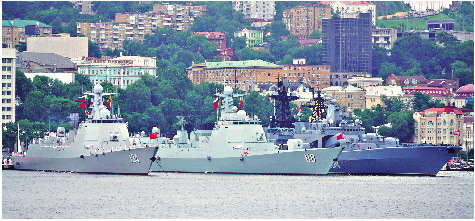 当地时间3日5时许,在俄方拖船和军港保障人员的配合下,中国海军西湖船和俄“别洛乌索夫”号救生船率先离港,随后中方绍兴舰、乌鲁木齐舰,俄方“特里布茨海军上将”号大型反潜舰、“响亮”号轻型护卫舰等依次驶离码头。离港完毕后,双方按照中俄舰艇混编的顺序迅即组成编队,驶向任务海域。辽阔海面上,中俄双方舰艇建立通信链路,互相通报海区水文气象、海空情况等信息要素。