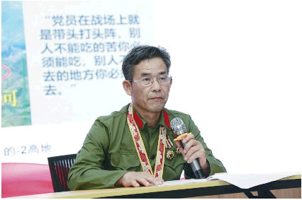 “今天我们还邀请到一位特殊的嘉宾,他就是‘退伍不褪色’的一等功获得者张玉宏。”随着主持人话落,张玉宏利落地转身敬礼。这位60岁的老人,声音铿锵有力、目光炯炯有神,为大家讲述了一段他的战斗经历。张玉宏将红色精神传递给在场的每一个人,大家深受触动,仿佛置身于那段峥嵘岁月。