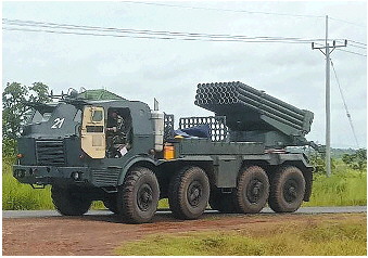据报道,在这次冲突中,柬埔寨向泰国发射了两枚BM-21火箭弹,其中一枚落入一座加油站。BM-21火箭炮是苏联研制的一种122毫米40管自行火箭炮,绰号“冰雹”,是世界上知名度最高的多管火箭炮之一,也是目前世界上装备数量最多的自行多管火箭炮之一,产量超过1.1万门。