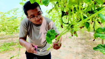 郝洪乐穿梭于葫芦架之间,汗水浸透了他的衣衫。