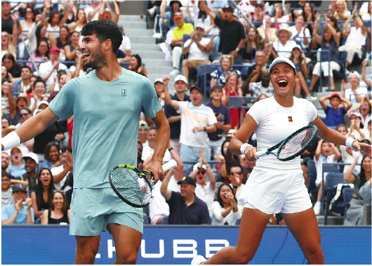 8月19日,阿尔卡拉斯(左)/拉杜卡努在美网混双比赛中。新华社发