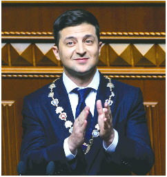 喜剧演员出身的泽连斯基,曾有过很多搞怪造型:五颜六色的T恤、各种图案的衬衫,甚至穿西装时领子上都要有彩色装饰。后来决定竞选总统后,他的着装风格稳重了许多。2019年的总统就职典礼上,泽连斯基的穿搭别出心裁:深蓝色西装内搭白色衬衫和蓝色领带,亮点是佩戴的由勋章相连组成的官衔链,每枚勋章上都印有乌克兰国徽。