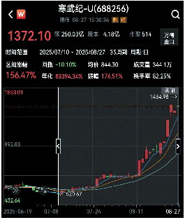 8月27日,寒武纪高开3.75%,盘中多次向贵州茅台发起冲击,最终于午后登顶。此后,股价震荡,尾盘涨幅收窄,最终收涨3.24%,报1372.10元/股。从7月10日至今,寒武纪区间涨幅156.47%,年内涨幅为108.53%。