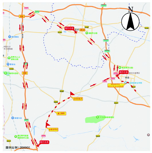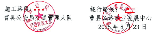 经菏泽市交通运输局菏交规建〔2024〕14号文件批准,计划于2025年8月25日至2025年11月11日实施G105京澳线曹县段(养护桩号K722+674-K738+338)修复养护工程,全长15.664km,届时该路段将实行“半幅封闭施工,半幅借道通行”的交通管制措施,施工期间禁止3轴及以上和危化品车辆通行,请以上车辆提前择路绕行,注意行车安全。