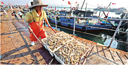 图为当天下午,在烟台市芝罘区东口抱港渔市码头,满载而归的渔船陆续到岸,一位渔民用手推车推着两筐刚捕到的爬虾离开码头,到岸上售卖。