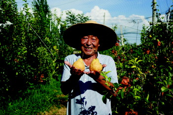 树叶被晒得半卷着,鸟儿躲避在阴凉处。伏天走后的第二天,天气依然酷热,暑气蒸腾下,人在阳光下站立几分钟,汗水还会湿透衣衫。“你们来得早了,如果晚来20天,等‘丑梨’成熟了,吃上一颗冷藏好的,就像吃冰激凌,再热的天也感觉不到热了,那才爽哩!”在莘县观城镇玉生果蔬种植专业合作社门口,一见面,翟玉生一边给我们递送遮阳的草帽,一边开始夸他的丑梨。