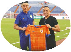 左上:宿茂臻向巴力斯塔(右)赠送球衣。右上:U15冠军队员在京鲁大战前展示奖杯。