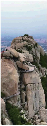 与山水相聚,心情总是明朗的。你看峄山上三块上百吨的怪石,叠罗汉般直竖在一块很小的岩石上,山风吹来晃悠晃悠,眨眼欲倒下,但它却在这里晃悠了不知多少年。