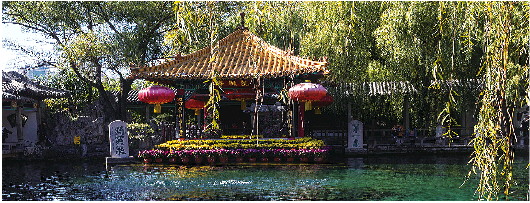 日头渐低,橙光漫洒。酒泉里镀了层金,石湾泉的水色也变了模样,白日里清澈碧绿的泉水此刻竟显出几分金属质感,一条白鲤浮游其间,若非它忽而探头,几不可辨。泉水被灯光染成翡翠色,水面浮着几片柳叶,像被谁随手撒下的书签。对岸的垂柳在夜风中轻晃,柳梢不时掠过水面,划出转瞬即逝的银痕。我未作停留,因心中惦念着另一处所在。无忧泉是我每来必至之地,爱它进门便见的小瀑布,爱“无忧”二字,更爱白雪楼环抱下那一方开放式的中式院落。此刻斜阳低垂,泉边游人匆匆,唯我驻足。那块我钟爱的石头仍在那里,十几年过去丝毫未变。记得最长一次在此盘桓近一个时辰,手捧趵突泉手册,细品周遭流动的历史,起身时竟不觉疲惫,从此便与这石头成了老友,无论只身前来还是偕友共赏,都会在此小憩。忽而园中灯火齐明,我才知道此处竟有夜景照明,心中不觉赞叹。方才隐没的锦鲤此刻尽现身形,游姿优雅至极,即便在瀑布激流处,也不见它们仓皇摆尾。那慵懒的尾鳍摆动,仿佛专为诠释此间泉水的韵律而生。