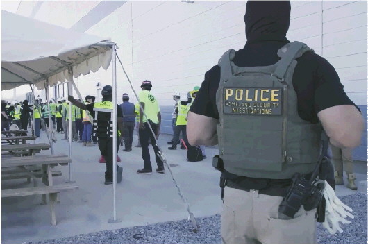 9月4日,在美国佐治亚州一家工厂,移民执法人员进行突击执法行动(视频截图)。 新华/美联