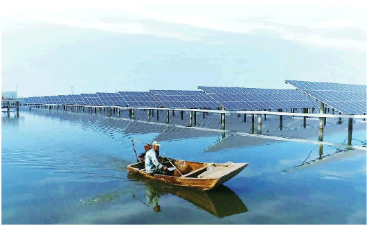 蓝色光伏板在水塘上整齐划一铺展开来,渔民撑一叶小舟,在鳞次栉比的光伏板间穿梭投饵。