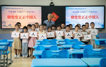 新生开学仪式 日前,沂源县振兴路小学邀请全国教育系统劳动模范李振华,为一年级新生代表开展了主题为“做堂堂正正中国人”的开笔礼仪式。 (王宗玲)