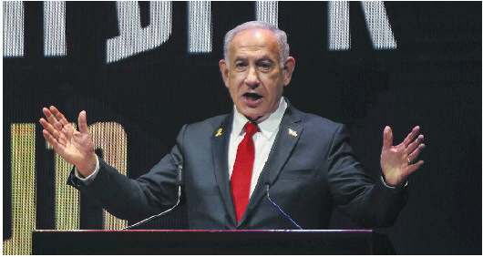 9月11日,以色列总理内塔尼亚胡在约旦河西岸犹太人定居点马阿勒阿杜明举行的协议签署仪式上讲话。 新华/法新