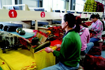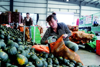 在潍坊寿光柒亩田农业有限公司的4000平方米的贝贝南瓜集散仓库里,传送带运着圆滚滚的南瓜不停运转,工人麻利地挑出破皮、畸形的果子,打包好的礼盒已码成小山,货车司机一摞摞的往车上装。“这是从刚内蒙古拉来的,这是明天发马来西亚的,这些是下午发河北的。”公司负责人刘新成拿起一颗贝贝南瓜自豪地说,“只要客户提出来,我们这儿随时都有货。”