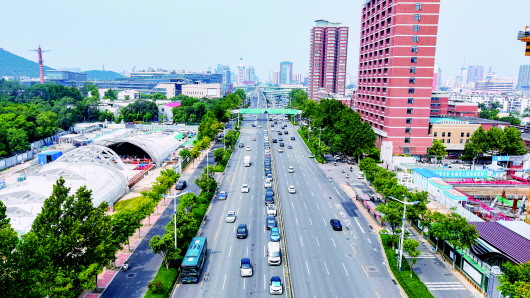 济南经十路泉城公园附近,有一座半地上车站。它的穹顶“浮”出地面,向经十路“抬起了头”。这就是全线最浅车站——泉城公园站(施工名,下同)。