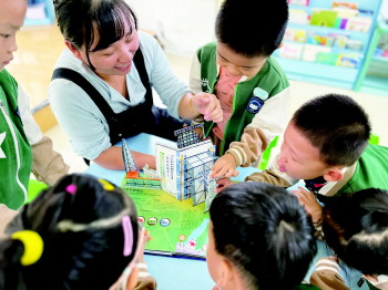 在街道“一老一小”服务中心,原来的党群服务中心被改造为老幼共用场所。一楼是老年活动空间,棋牌桌、书画室一应俱全;二楼则是孩子们的绘本屋和游戏区。午后时分,老人和孩子们一起做面点、上书画课,形成了“老小孩与小小孩共乐”的动人场景。