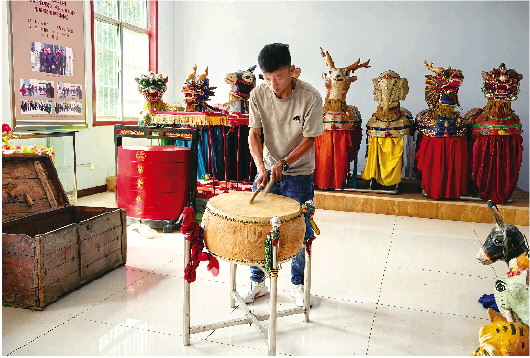 大洼村的非遗展厅就设在村委里。推开展厅木门,最先映入眼帘的是屋中央那口深褐色老木箱。箱体简陋,连边缘起到保护作用的铜件都没有,开关时会发出轻微的“吱呀”声,但是却已传承了百余年。“这箱子是从光绪二十三年(1897年)传下来的,以前老一辈艺人就是用这个箱子装戏服、道具,现在是我们的‘镇馆之宝’。”张波说。