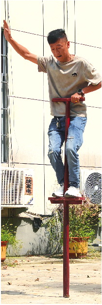 这份“无缚”的底气,源自一代代人的摔打。看着木箱里的旧物,他的思绪回到了30年前:那是他刚上小学时,用的是短杆,“独杆跷一般都是用槐木制作,质地比较坚硬,高度60厘米、80厘米,一米二的也有。”第一次踩上去,没几秒就摔了,胳膊肘蹭破了皮,练习的过程中没少挨摔,师傅只让他自己站起来,强调“要掌握好平衡,你稳它就稳”。