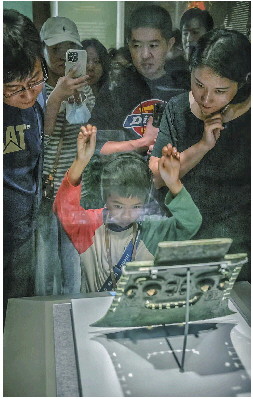 静听国宝。假期里,参观者簇拥在山东省博物馆镇馆之宝之一,国家一级文物,商代青铜重器“亚醜钺”展台前静静地听着讲解。 俞军 摄
