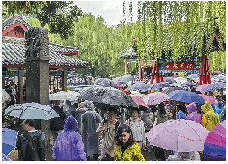 ◥雨中的趵突泉,花伞簇泉人头攒动。 王平 摄