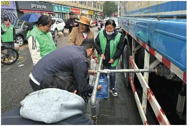 在临时取水点,志愿者们帮助居民接水、送水到家。