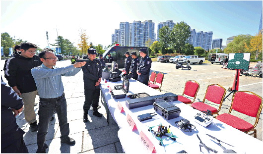 10月22日,“智守山海 共筑防线”中国反走私文化大篷车暨山东反走私一线行(烟台站)在烟台大学启动。活动通过沉浸、互动、情景化等创新形式,打造集成果汇报、科普教育、展览体验于一体的综合活动,展现烟台反走私的“全景答卷”。图为参观者现场体验警用装备。 记者 吕奇 摄影报道