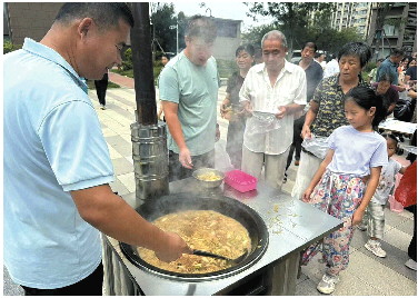 在灶台刚架起来时,很多居民就带着自家的饭碗来到这里,早早排起了长队。队伍中,有头发花白的老人,有朝气蓬勃的年轻人,还有蹦蹦跳跳的孩子,大家你一言我一语,脸上洋溢着期待的笑容,温馨而热烈。