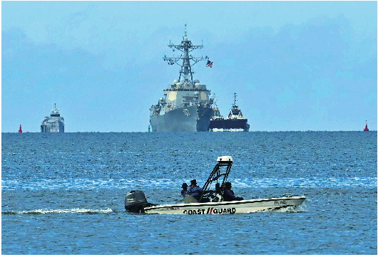 10月26日,美军导弹驱逐舰“格雷夫利”号(上中)在特立尼达和多巴哥首都西班牙港附近海域航行。 新华/法新