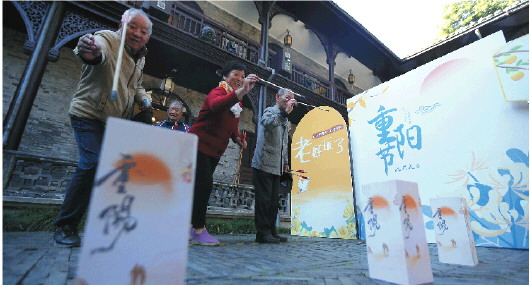 ◥九九重阳节这天,江苏省扬州市何园景区的老年人在玩投壶游戏。  新华社发