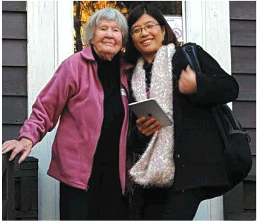 玛格丽特将贺爱霞让进屋里,颤颤巍巍地走进厨房,为她沏了一杯热茶。贺爱霞趁这个空当,迅速地在贺卡上写了几句感谢的话。二人相谈甚欢,还抱着赫士的老照片合了影。