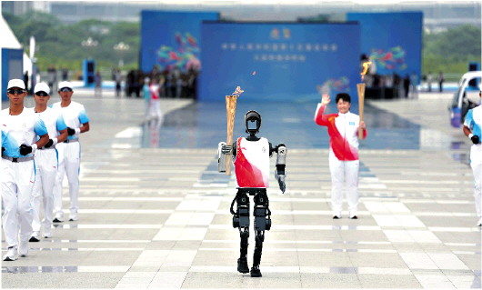 11月2日,火炬手人形机器人“夸父”在传递火炬。