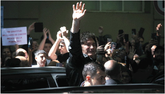 10月26日,阿根廷总统米莱在布宜诺斯艾利斯一处投票点外向选民挥手致意。 新华社发
