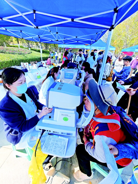 山东第一医科大学附属眼科医院(山东省眼科医院)展位前,在医护人员的引导下有序排起了队。医院带来了视力表灯箱、验光仪、眼压计、裂隙灯等共计6台专业眼科检查设备,涵盖多个基础且重要的眼科项目,可以筛查出不同年龄段的常见眼科疾病。短短一上午,眼科团队就为300多名市民完成了检查。