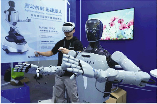 11月6日,在2025年世界互联网大会“互联网之光”博览会现场,一家企业工作人员展示人形机器人同步模仿精细动作。(新华社)