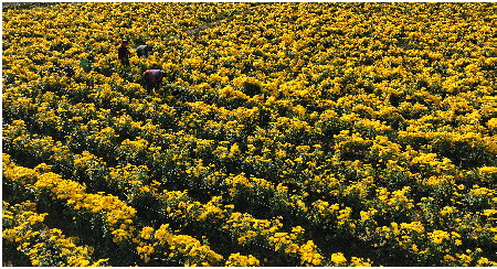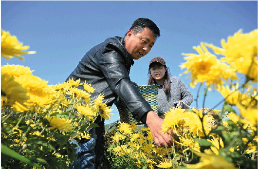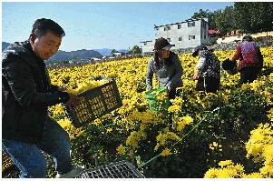 眼下已经进入菊花采摘期,村民们忙着埋头采花,鲜花亩产量在2000多斤。