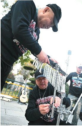 ◤老男孩乐队成员正在安装乐器和音响,准备晚上的公益演出。