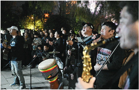 鼓点吉他,歌声琴声,11月4日晚上,深秋的大明湖畔,老男孩乐队正在演出,一首首脍炙人口的歌曲,让路过的市民和游客忍不住慢下脚步驻足上前,加入这场音乐聚会之中。观众中有头发逐渐花白的中老年人,有下班路过的年轻人,有前来超然楼打卡的游客,还有做完作业出来玩的小朋友……他们或大声合唱,或随着节奏挥舞双手,深秋的浪漫与活力在此时具象化。