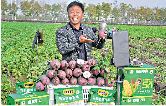 11月11日,在青岛市即墨区起戈庄村的“冰激凌”水果萝卜种植基地,村支书网上直播卖萝卜。