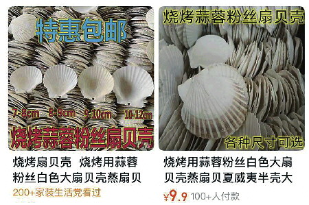 淘宝上有多家店铺售卖“烧烤专用扇贝壳”。