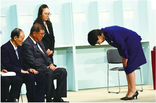 10月4日,在日本东京的自民党总部,高市早苗(右一)在自民党总裁选举中胜出后鞠躬致意。 新华社发