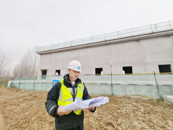 莒南再生水项目,李高贤在翻阅技术图纸。