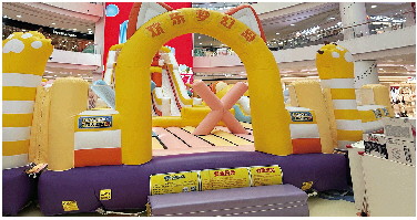济南一商场内摆放的充气城堡,入口处印有安全提示和游玩须知。