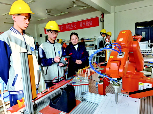 章丘中等职业学校的实训区,学生在进行操作。