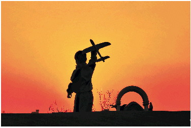 夕阳下放飞机的小朋友。 高军 摄