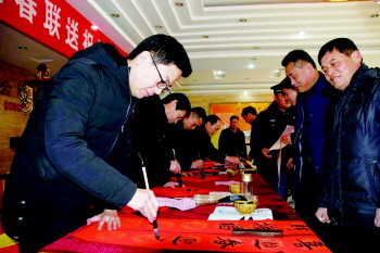 胡跃东(左)带队送春联。