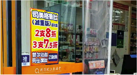 原本治疗糖尿病的司美格鲁肽因显著的减重效果被冠上“减肥神药”的名号走红,这是成都一家药店门口的促销广告。 新华社发